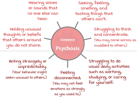 La psicosis puede hacerte experimentar la realidad de una manera diferente a quienes te rodean. La mayoría de las personas que padecen psicosis describen tener creencias inusuales que otros no comparten y ver u oír cosas que otros quizás no comparten. La psicosis puede causar un amplio espectro de experiencias que incluyen: